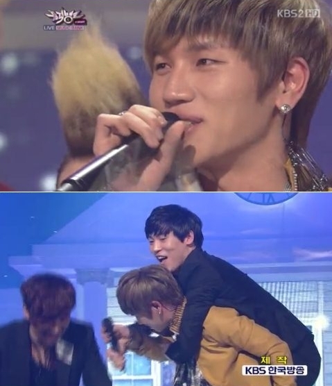 케이윌은 2일 방송된 KBS 2TV '뮤직뱅크'에서 '니가 필요해'로 1위를 차지했다. 케이윌은 앵콜 곡이 시작되자 존 박을 업은 것.