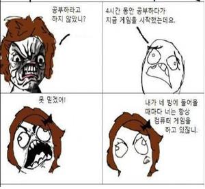 엄마는 "내가 네 방에 들어올 때마다 너는 항상 컴퓨터 게임을 하고 있잖니"라고 야단쳐 주인공은 억울해한다. 이 만화는 웃음을 유발하며 많은 이의 공감을 얻고 있다.
