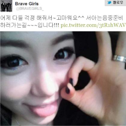 브레이브걸스가 방송사고 후 공식 트위터를 통해 “다들 걱정해줘서 너무 고마워요 서아는 음중 준비하러 가는 길”이란 글과 함께 사진을 게재했다.