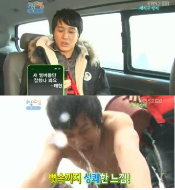 차태현은 차가운 날씨 속에서도 상채 탈의를 한 채 차가운 우물로 등목을 하며 "으악"이라고 비명을 질러댔다.
