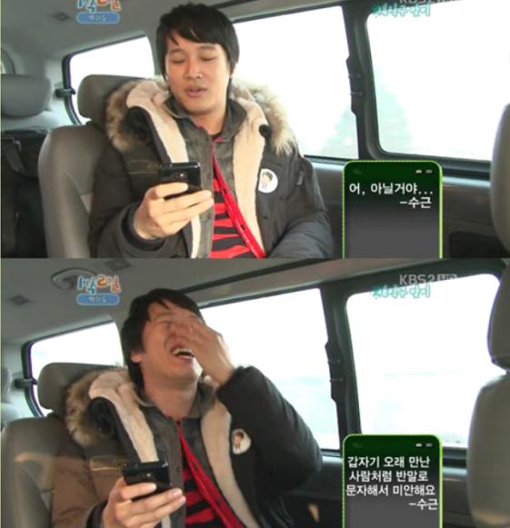 4일 방송된 KBS-2TV ‘해피선데이-1박2일’에 새 멤버로 합류한 차태현은 이수근에게 문자를 받고 웃음을 참지 못했다.