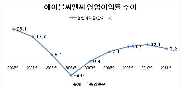 영업이익률이 하락, 수익성이 악화된 것. 2009년과 2010년 2년 연속 증가세였던 영업이익률이 지난해 전년대비 2.9%p 줄어든 9.2%를 기록했다.