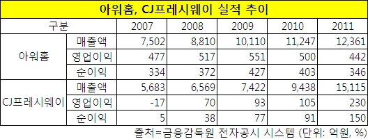 CJ프레이시웨이는 영업이익과 순이익이 각각 117%, 66% 급증한 230억원과 60억원을 달성했다. 이에 반해 아워홈은 각각 11.6%, 14.1% 줄어든 442억원과 346억원을 기록했다.