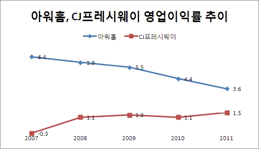 매출을 제외한 영업이익과 순이익, 영업이익률은 아워홈이 앞서 있다. 하지만 CJ프레시웨이는 수익성이 계속 개선되는 곡선을 그리는 반면 아워홈은 반대로 움직이고 있다.