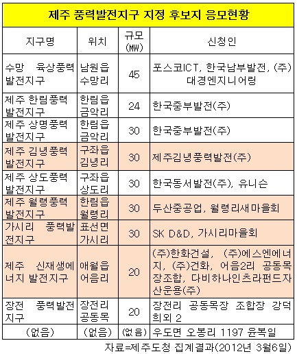 반면 포스코ICT, 한국남부발전, 대경엔지니어링이 참여한 제주 남원읍의 '수망 육상풍력발전지구' 등 후보지 5곳은 풍력발전소가 들어설만큼 부지가 넓지 않거나, 제주 고유의 오름 등을 훼손시킬 우려가 있어 탈락됐다.