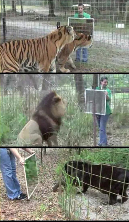사자는 거울 속의 자신의 모습을 적이라고 생각하고 위협을 하다가 이내 시큰둥한 반응을 보였다.