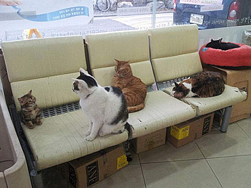 공개된 사진에는 여러 마리의 고양이들이 애완견 센터로 보이는 장소의 소파 위에 각기 포즈를 취하고 앉아 있다.