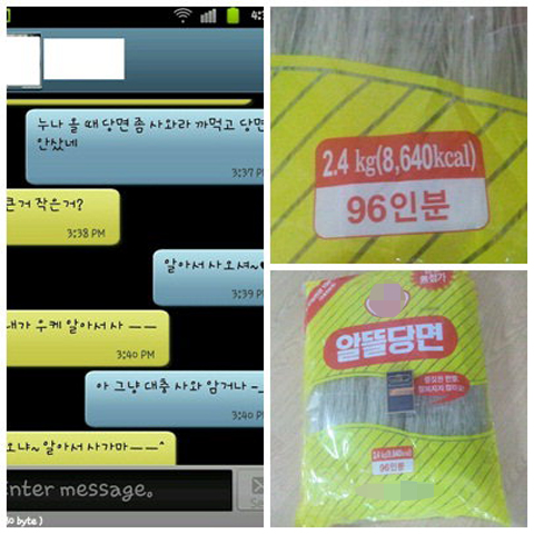 동생은 “알아서 사와”라고 말한다. 그러나 사진에서 누나가 사 온 당면은 무려 96인분 짜리 대형 당면이다.