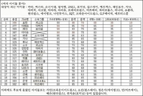 이 표에 따르면 가창력 서열 1위는 씨스타의 보컬 효린이 차지했다. 이어 다비치 이해리, 브아걸의 제아, 아이유, 소녀시대 태연 등의 순위로 매겨졌다.