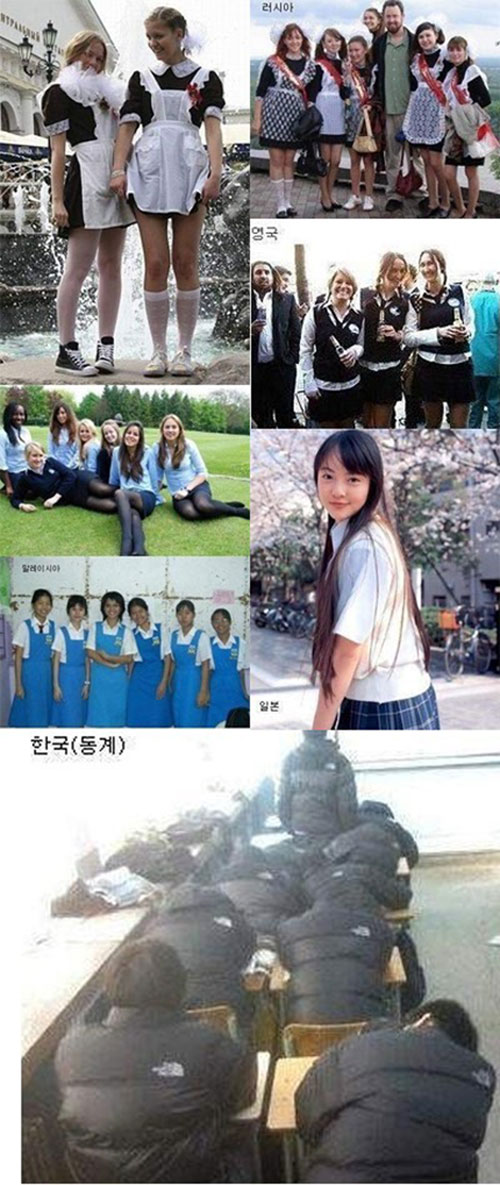 전세계 교복 모음 사진에 네티즌들은 "한국 동계 빵 터졌다", "씁쓸하네요", "한국은 진짜 최악이다", "고가의 패딩이 문제"등의 다양한 의견을 내놓았다.