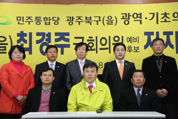 민주통합당 북구을 광역·기초의원 일동은 8일 오전 11시 광주광역시의회 기자실에서 "변화를 바라는 민심의 요구가 커지는 상황에서 정치개혁과 경제민주화를 이룰 지역의 일꾼으로 최경주 예비후보를 적극 지지하기로 의견을 모았다"고 밝혔다.