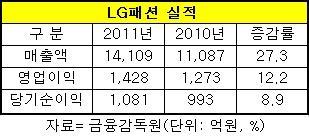 LG패션은 작년 경기침체 한파속에서도 풍성한 수확을 거뒀다. 매출액은 1조4천109억원으로 전년대비 27.3% 늘었고 영업이익과 당기순이익은 각각 1천428억원, 1천81억원으로 12.2%, 8.9% 증가했다.