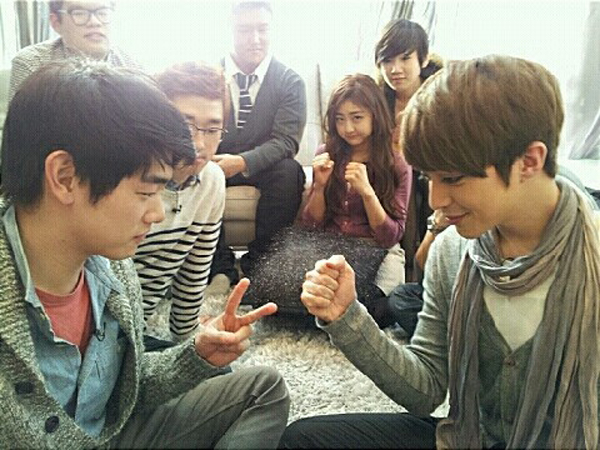 사진에서 셰인과 에릭남 두 사람은 가위바위보 대결을 하고 있고, 주위에는 위대한 탄생 멤버들이 진지하게 둘의 대결을 바라보고 있어 눈길을 끈다.