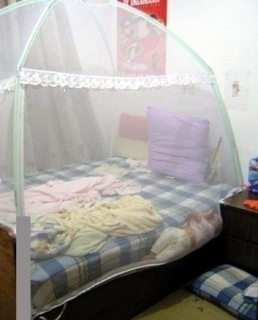그러나 사진을 자세히 살펴보면 동생은 침대 아래로 떨어지지 않고 모기장 사이에 끼어있다.