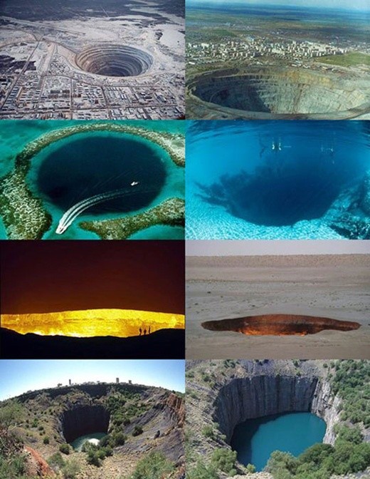 지구에서 가장 큰 구멍에는 동부 시베리아에 위치한 미르 광산, 벨리즈 공화국 연안에 자리 잡고 있는 그레이트 블루홀, 남아프리카 공화국 킴벌리 지역에 위치한 킴벌리 빅홀, 미국 유타주 빙행 구리광산, 1971년 구 소련시절 지질학자들에 의해 발견된 '지옥의 문' 등이 선정됐다.