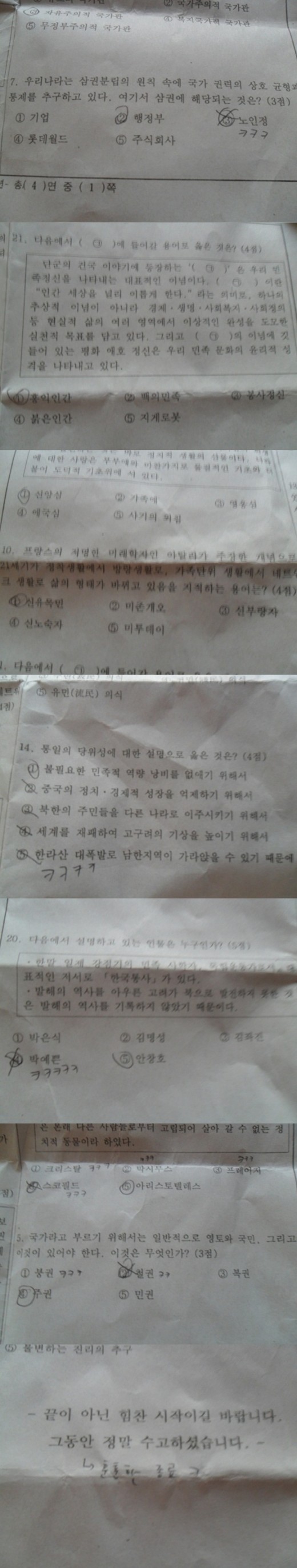 게시자에 따르면 해당 시험지는 중학교 3학년 2학기 시험지로, 게시자는 "선생님이 시험문제 내기 진짜 귀찮았나 보다’라고 설명하고 있다. 또 시험지 끝에는 ‘끝이 아닌 힘찬 시작이길 바랍니다’라는 문구가 적혀 있어 더 눈길을 끈다.