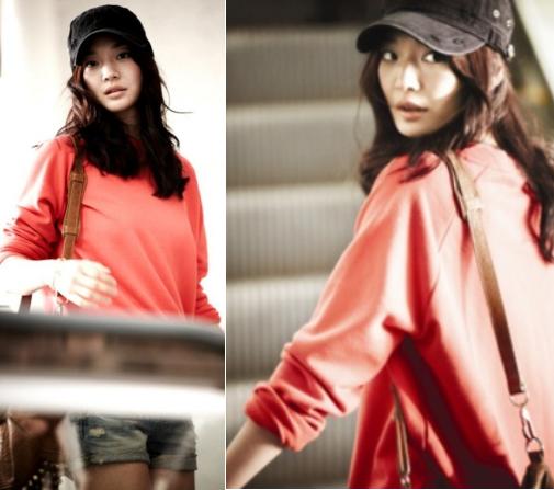 그녀는 핫팬츠에 살구색 티셔츠로 봄의 느낌을 연출했다.