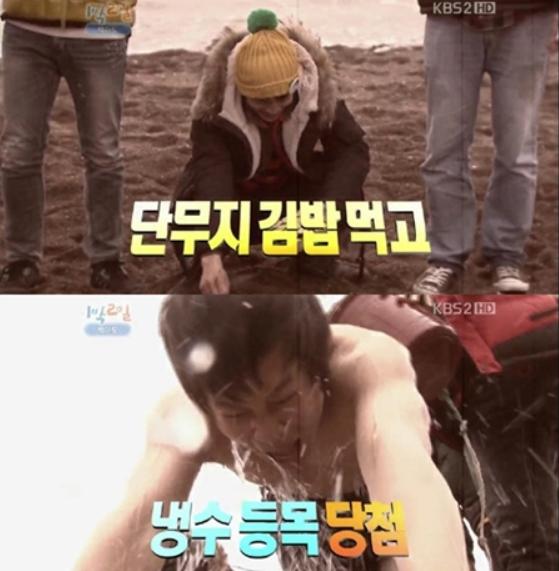 차태현은 이날 묵찌빠 게임에 패하며 목적지까지 서서 가야했다. 이어 닭싸움에서 져 단무지 김밥이 당첨되고, 산에 갔다가 우물 등목도 당첨된다.