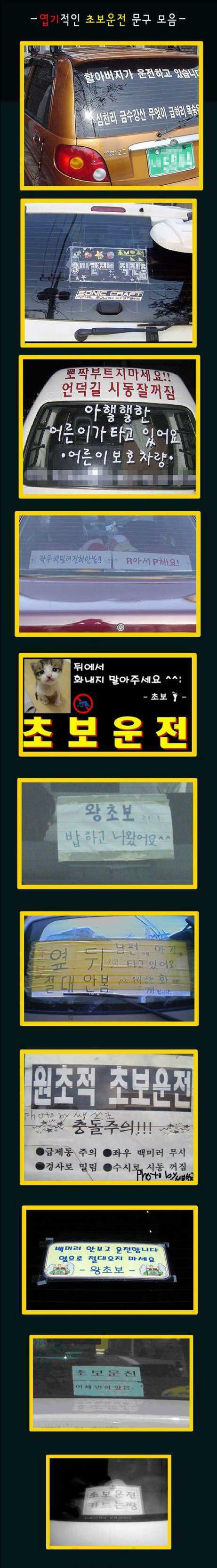 공개된 초보 운전 스티커 좋은 예 게시물을 보면 "R아서 P해요", "왕초보, 밥하고 나왔어요", "할아버지가 운전하고 있습니다. 삼천리 금수강산 무엇이 급하리", "바짝 붙지 마세요! 언덕길 시동잘꺼짐"등의 재미있는 문구들이 보인다.
