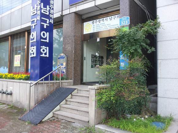 남구의회가 위치한 건물의 출입구에 설치된 장애인 통로는 가파른 경사로 인해 의회의 방청이나 민원을 위한 출입이 거의 불가능하다.