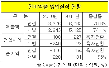 한편 한미약품은 지난해 어려운 제약 환경에서도 매출액 5천125억원을 기록하고 흑자경영에 성공했다. 한미약품은 2010년 7월 기업분할 이후 수백억원의 영업손실액을 기록하면서도 신약개발등 공격적인 투자를 감행하며 성장 드라이브를 걸었다.