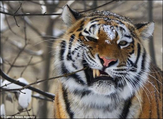 해당 사진은 오스트리아 티어가르텐 쉔브룬 동물원에 사는 시베리아 호랑이로 나뭇가지로 이빨 찌꺼기를 제거하고 있다.