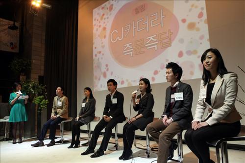 이정국 CJ 인사팀 부장은 "권위적이고 일방적인 채용 설명회를 탈피하고 양방향 소통을 통한 올바른 채용 정보와 더불어 즐거움을 선사해 취업난에 절망하고 있는 예비 지원자들에게 희망을 주기 위해 이색 채용설명회를 기획했다"고 설명했다.