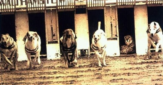 이 사진에서는 개들의 경주 모습이 담겨 있다. 그러나 사진을 살펴보면 개들 사이에 치타 한 마리가 아직 출발하지 않고 개들을 지켜보고 있는 모습이다.