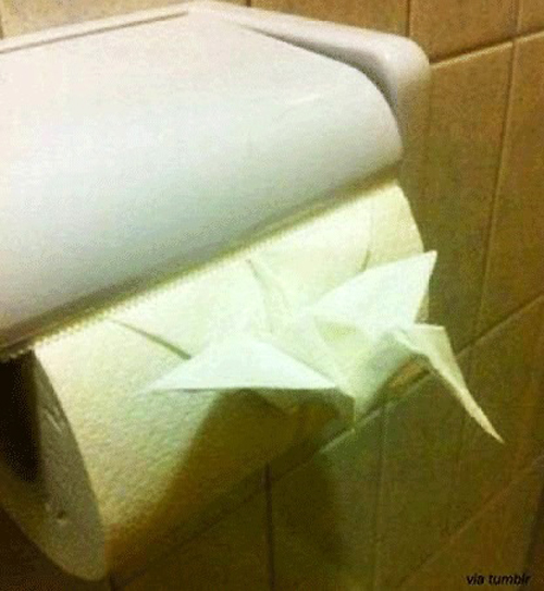 공개된 사진에는 화장실 휴지 끝단을 종이학으로 예쁘게 접은 모습을 담고 있다.