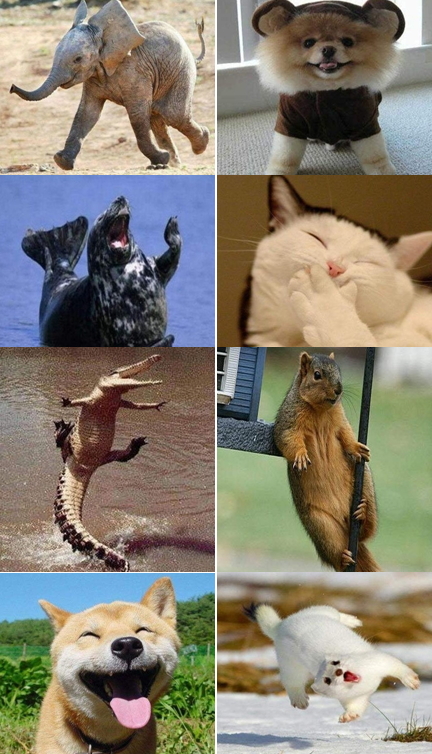 사진 속에는 흥겹게 걷고 있는 코끼리, 귀여운 강아지, 웃고 있는 물개, 점프하고 있는 악어 등의 모습이 담겨 있다.