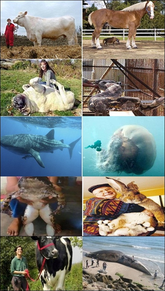 공개된 사진은 같은 종에서 일반적인 크기보다 더욱 큰 덩치를 자랑하는 동물들을 모아놓은 사진으로 사람의 키보다 더 큰 젖소와 말과 비슷한 크기의 개 등이 눈길을 끌고 있다.
