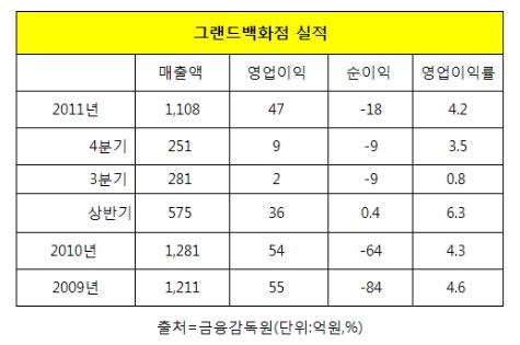 금융감독원에 따르면 그랜드백화점의 재무지표는 크게 불안정하다. 계속된 매출감소와 순손실 확대로 재무구조에 큰 타격을 입은 것으로 알려진다.