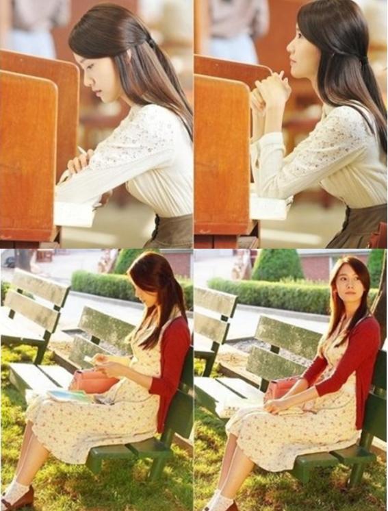이에 '사랑비' 촬영 중 찍힌 사진에서 윤아는 원피스를 입고 공부중이거나 벤치에 앉아 청순한 미모를 뽐내고 있다.