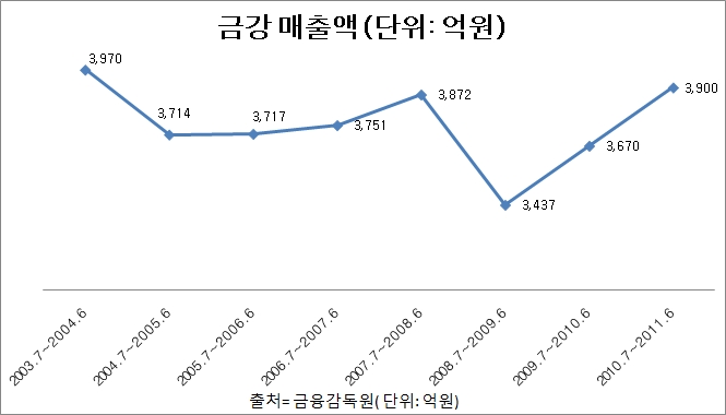 한편 금강제화(6월 결산법인)의 2010년 회기(~2011년 6월 30일) 매출액은 3천896억원으로 8년전인 2003년 3천970억원과 크게 다르지 않다.