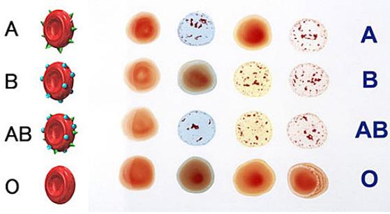 그림에서 A형은 뾰족한 돌기가 있으며 B형은 동그란 돌기가 있다. AB형는 뾰족한 돌기와 동그란 돌기를 모두 가지고 있으며 O형은 돌기가 없는 매끈한 모양이다.