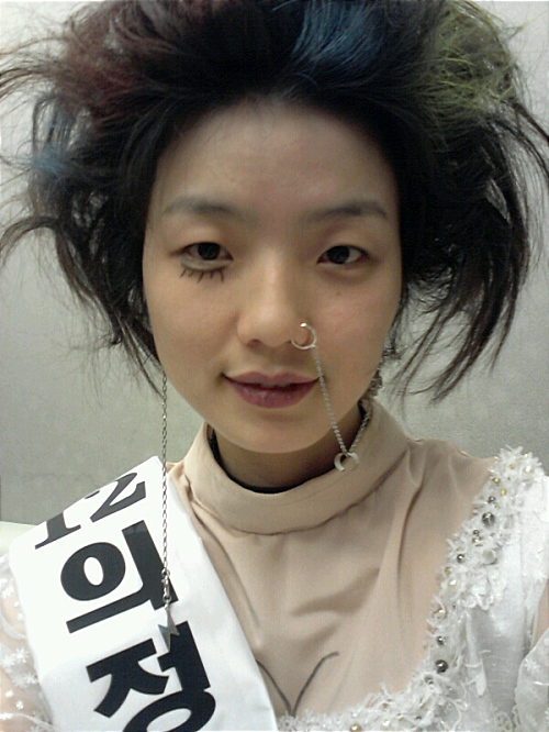 미인대회에 나가는 듯한 띠와 드레스 안에는 누드톤 상의를 입고 가슴골을 펜으로 그려 놓아 웃음보를 자극한다.