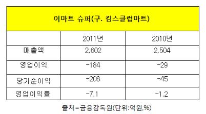22일 금융감독원에 따르면 이마트 슈퍼의 지난해 매출액은 2천602억원을 기록, 전년대비 3.9% 증가했다. 매출액은 소폭증가 했지만 수익성이 크게 뒷걸음질쳤다. 이마트 슈퍼의 지난해 영업손실은 184억원으로 2009년과 비교해 5배 이상 적자폭이 확대됐다. 같은 기간 당기순손실도 206억원으로 전년( 45억원)보다 크게 늘었다.