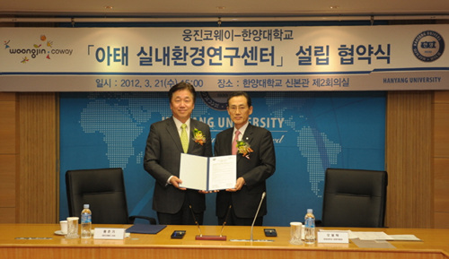 웅진코웨이(대표 홍준기)가 한양대학교(총장 임덕호)와 국제적 실내 공기 환경개선을 위한 '아시아 태평양 실내 환경 연구센터'를 설립하기로 했다.