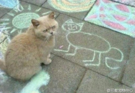 이에 사진은 마치 고양이가 바닥의 고양이 그림을 보고 화가난 것 처럼 보인다.