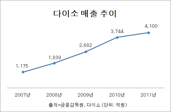 금융감독원과 다이소아성산업측에 따르면 지난해 매출액은 4천100억원으로 4년전과 비교해 무려 2.5배 성장했다. 영업이익률 역시 2009년 1.2%에서 2010년 3.6%로 높아졌다.