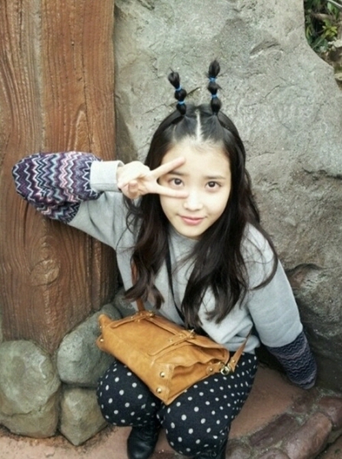 공개한 사진에서 아이유는 귀여운 도깨비 머리를 하고 브이자를 그리며 쪼그리고 앉아있다.