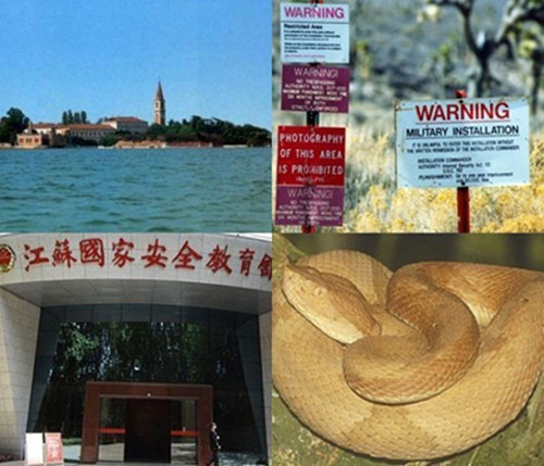 중국 장쑤성의 한 박물관 또한 중국 스파이의 역사가 담겨 있기 때문에 외국인은 들어갈 수 없으며, 맹독성의 뱀이 가득하다는 이유로 출입이 금해진 브라질의 한 해안도 누리꾼들의 이목을 집중시켰다.