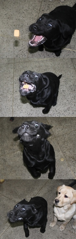 해당 사진 속에는 검은 개가 주인이 던지는 건빵을 받아먹고 누런 개가 이를 바라보는 장면이 담겨있다.