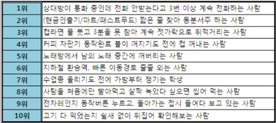 해당 글에 따르면 한국인 급한 성질 Best 10 중 1위는 ‘상대방이 통화 중인데 전화 안받는다고 3번 이상 계속 전화하는 사람’이 꼽혔다.