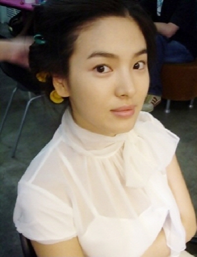 사진 속 송혜교는 머리에 롤을 만 채 민낯에 가까운 얼굴로 카메라를 응시하고 있다.