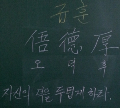 공개된 사진에는 칠판에 적힌 ‘급훈 俉德厚(오덕후)’라는 글씨와 ‘자신의 덕을 두텁게 하라’라는 뜻풀이가 되어었다.