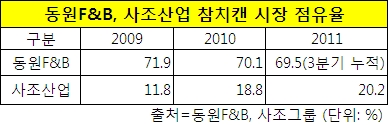 반면 동원F&B 참치캔 시장 점유율은 2009년 71.9%에서 작년 3분기 기준 69.5%로 조금씩 떨어지고 있다.