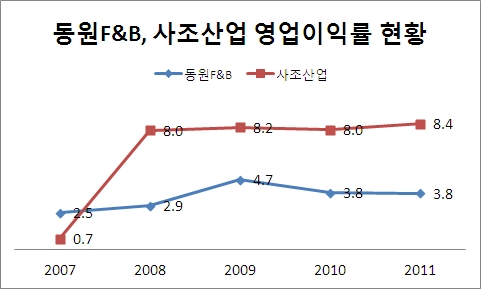 반면 동원F&B는 최근 4년간 평균 영업이익률 3.8%대를 기록하며 상대적으로 빈약하다. 동원F&B의 작년 영업이익률도 전년과 비슷한 수준인 3.8%로 마감했다.