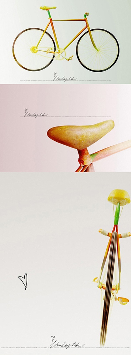 이 자전거는 당근 오렌지, 오이, 소시지, 생강, 레몬, 치즈 등 먹을 수 있는 재료를 이용해 만들었다. 접착재로는 올리브 오일과 시럽이 사용돼 '먹을 수 있는 자전거'가 만들어졌다.