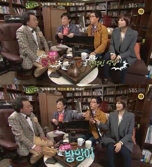 김정운은 김제동의 야구방망이를 들고는 "물건의 왜소함에 대한 불만이나 그런 것들이 있어서 자꾸 물건에 집착하는 거다"고 평가해 중의적인 표현으로 웃음을 이끌어 냈다.